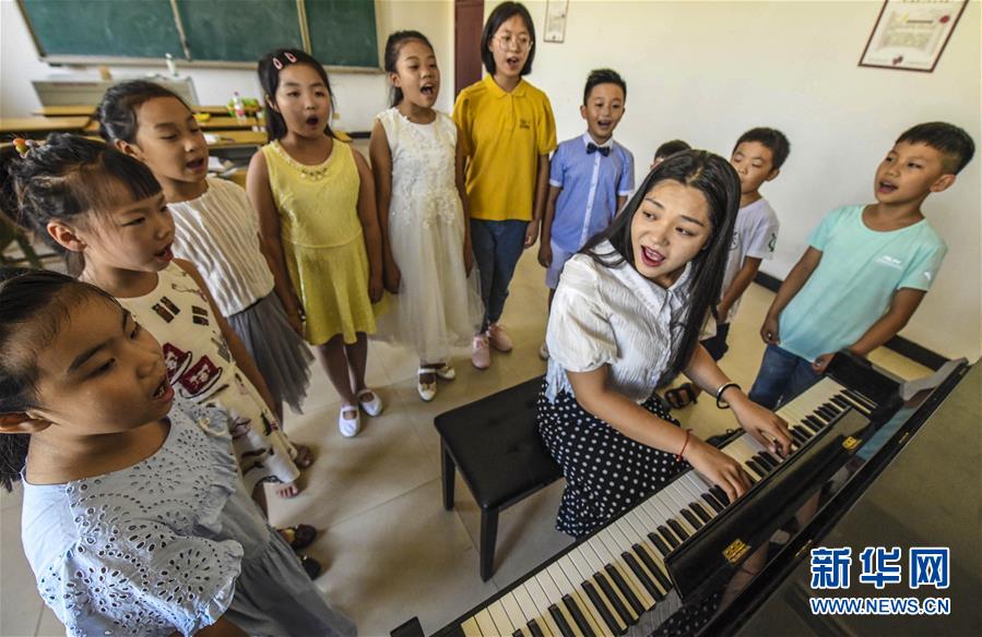 8月21日,在文安县青少年活动中心,声乐社团的教师在辅导孩子学习声乐。新华社记者李晓果 摄