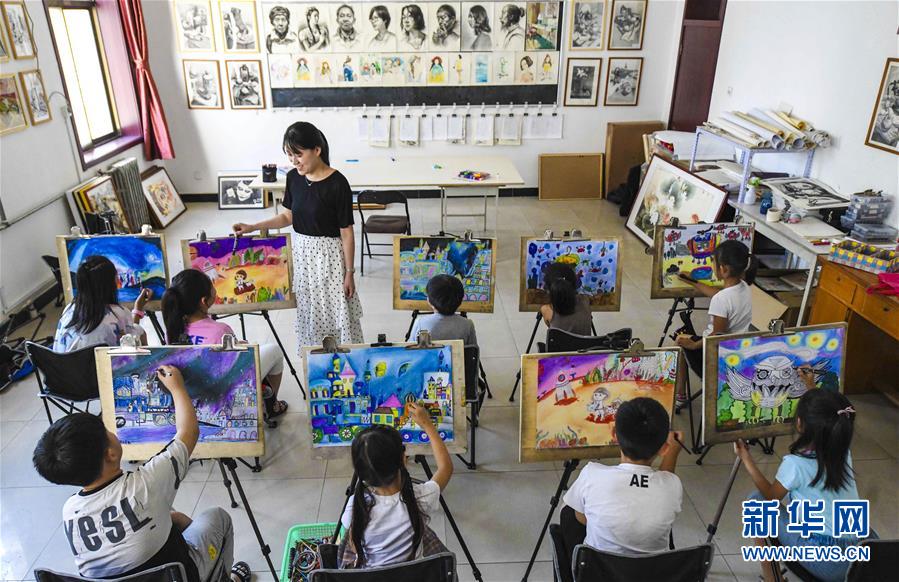 8月21日,在文安县青少年活动中心,学生参加公益绘画培训。新华社记者李晓果 摄