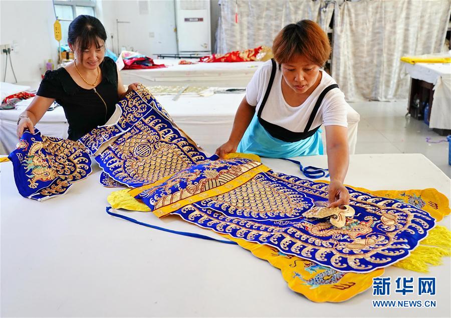 河北省肃宁县邵庄乡东高口村的民间艺人至今传承着传统戏曲服装服饰制作技艺,村中掌握戏曲服装裁制、刺绣、缝制等工艺的艺人有100多名。目前,该村有戏曲服装、服饰作坊三家,常年为北京、天津、上海、石家庄、西安等地专业戏曲院团及戏曲爱好者制作戏曲服装、服饰。新华社记者杨世尧 摄
