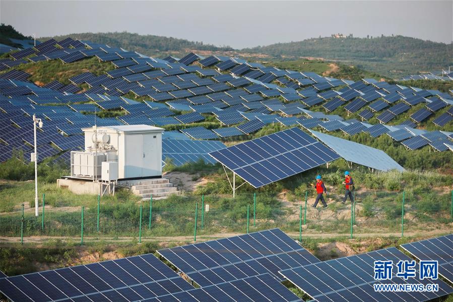 国网内丘县供电公司技术人员在内丘县柳林镇虎头山光伏电站内巡检(8月21日摄)。 近年来,河北省内丘县积极探索利用荒山坡地发展光伏发电,先后建成南赛乡集上赛、柳林镇虎头山2个荒坡光伏发电场,总装机容量50兆瓦,实现利用荒地2400余亩。新华社记者 牟宇 摄