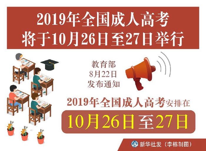 新华社北京8月22日电(记者施雨岑)教育部22日发布通知,就做好2019年全国成人高考工作进行部署。根据这份通知,2019年全国成人高考安排在10月26日至27日。