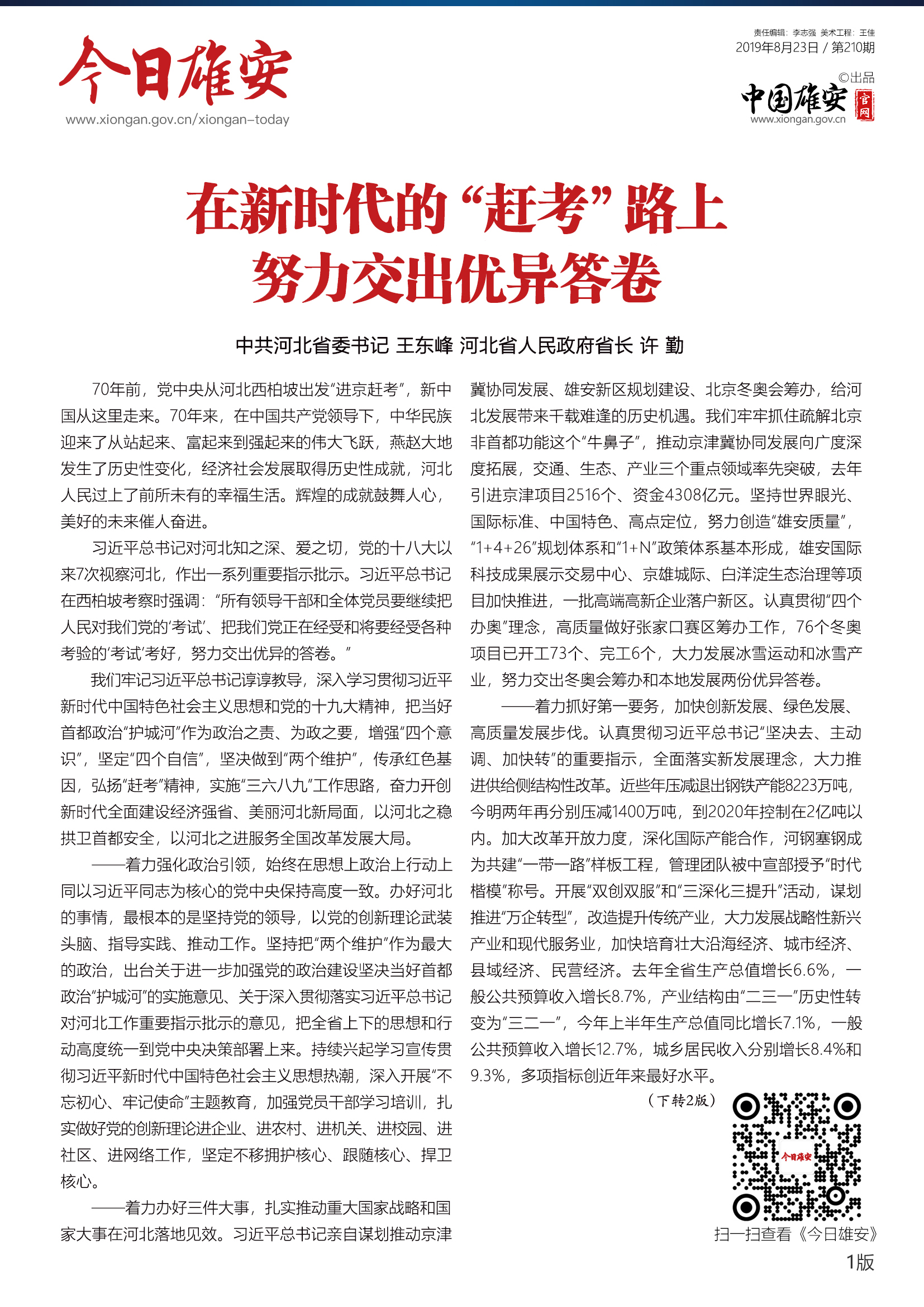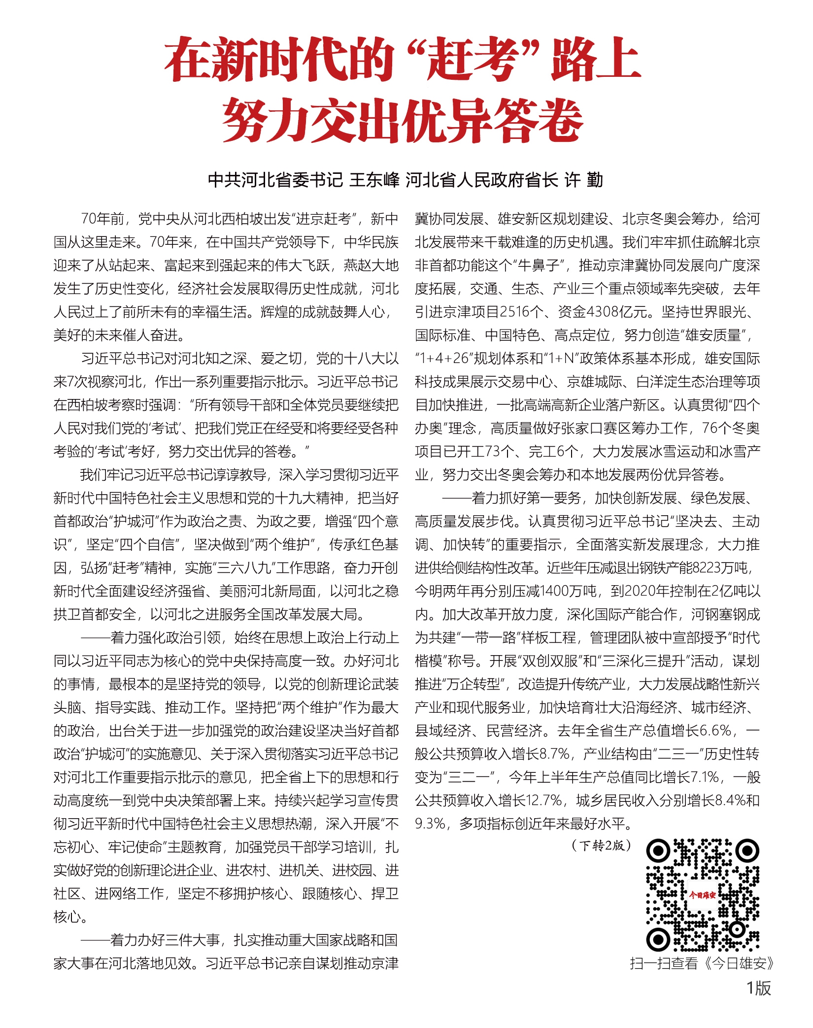 中共河北省委书记王东峰,河北省人民政府省长许勤在2019年8月22日的《人民日报》发表署名文章《在新时代的“赶考”路上努力交出优异答卷》。