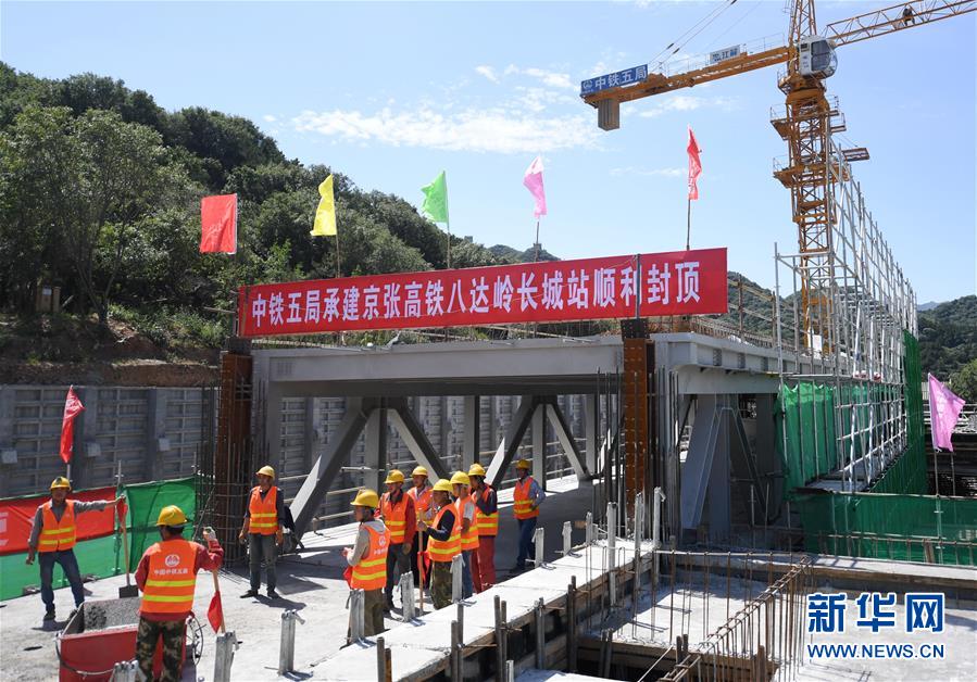 8月23日拍摄的京张高铁八达岭长城站站房主体结构封顶施工现场。 当日,伴随着最后一罐混凝土浇筑完成,京张高铁八达岭长城站站房主体结构正式封顶。至此,京张高铁全线站房主体结构建设全部完成,转向装饰装修、机电安装和信息工程施工阶段。新华社记者 张晨霖 摄