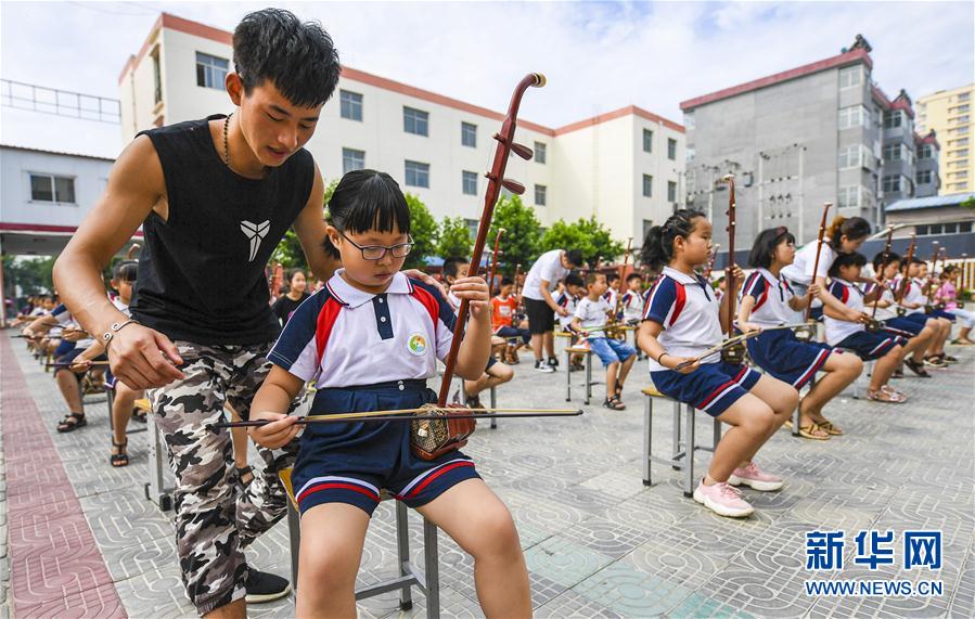 8月22日,在饶阳县第一实验小学校园里,老师指导学生拉二胡。
