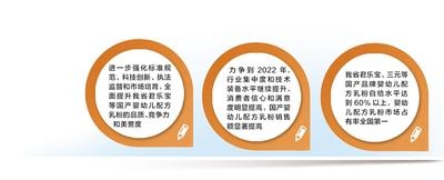 工作方案明确,实施三大行动计划的任务目标是:进一步强化标准规范、科技创新、执法监督和市场培育,全面提升我省君乐宝等国产婴幼儿配方乳粉的品质、竞争力和美誉度,力争到2022年,行业集中度和技术装备水平继续提升,消费者信心和满意度明显提高,国产婴幼儿配方乳粉销售额显著提高,我省君乐宝、三元等国产品牌婴幼儿配方乳粉自给水平达到60%以上,婴幼儿配方乳粉市场占有率全国第一。