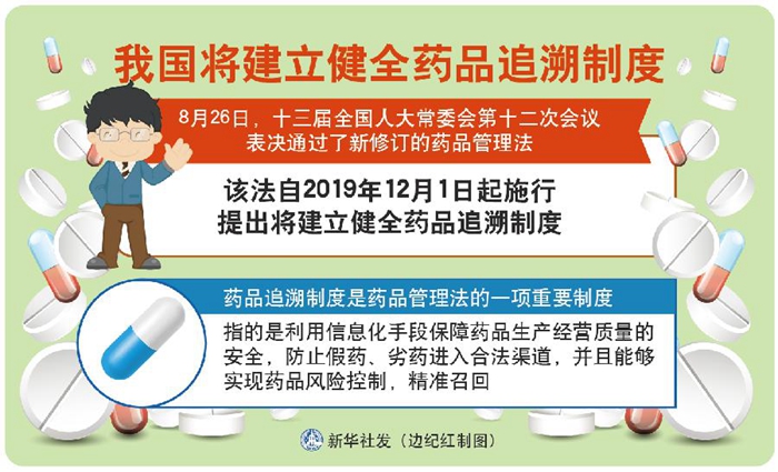 新华社北京8月26日电(记者屈婷、赵文君)26日,十三届全国人大常委会第十二次会议表决通过了新修订的药品管理法。该法自2019年12月1日起施行,提出将建立健全药品追溯制度。