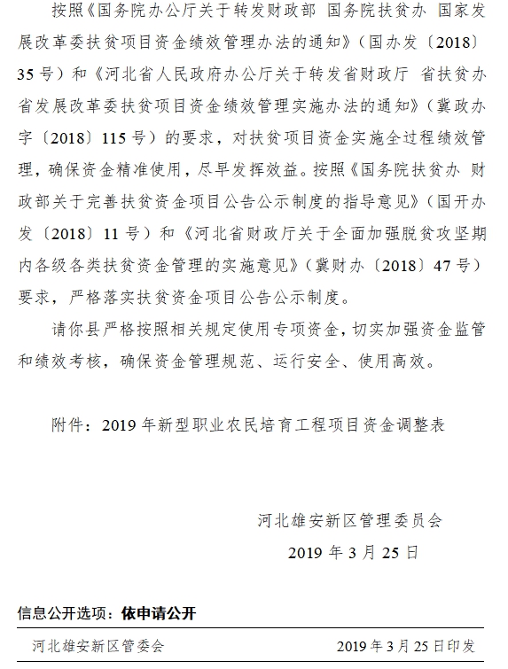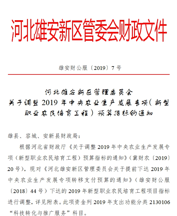 现将雄安新区调整2019年中央农业生产发展专项(新型职业农民培育工程)预算指标予以公告,如有异议,请向以下部门提出意见。