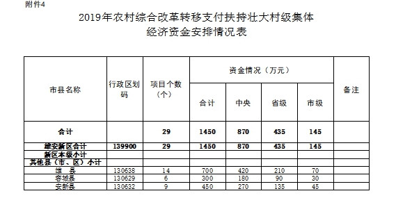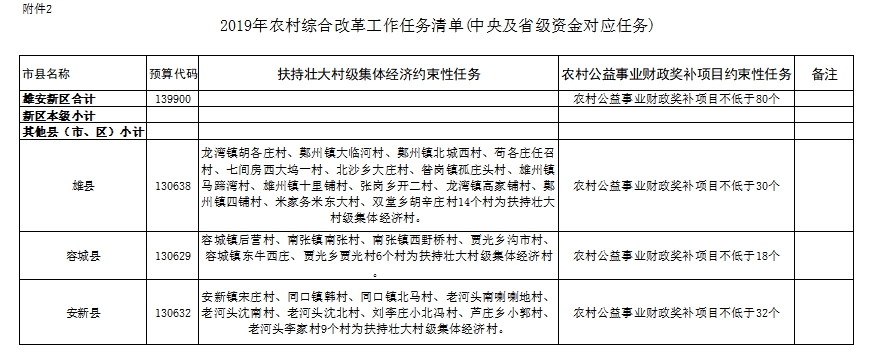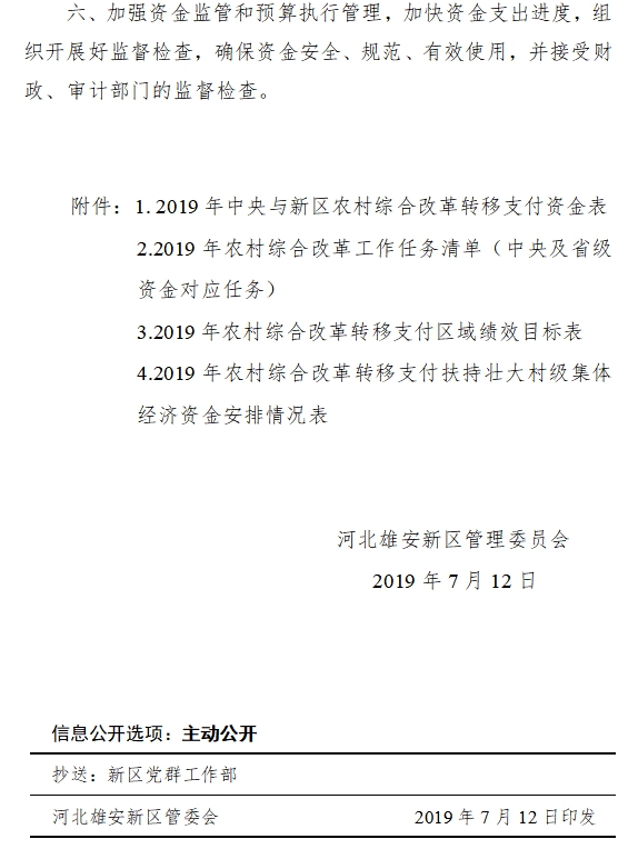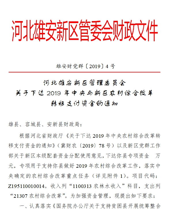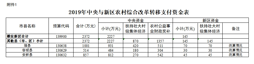 现将雄安新区下达2019年中央与新区农村综合改革转移支付资金资金分配结果予以公告,如有异议,请向以下部门提出意见。