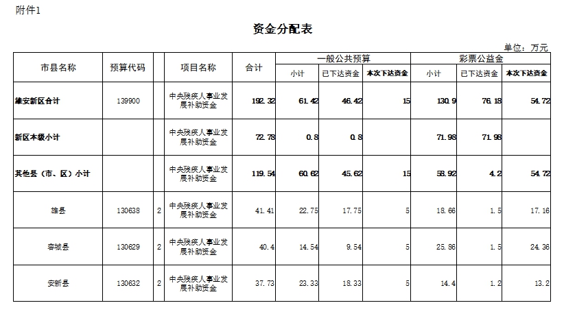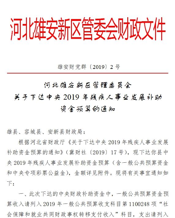 现将雄安新区下达中央2019年残疾人事业发展补助资金预算资金分配结果予以公告,如有异议,请向以下部门提出意见。