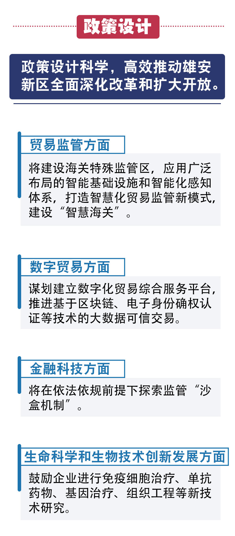 河北自贸试验区将结合雄安新区总体规划和建设开放发展先行区的有关要求,建设高水平综合保税区,发展各类新型贸易业态,打造高标准高质量自由贸易园区,引领雄安高质量发展。