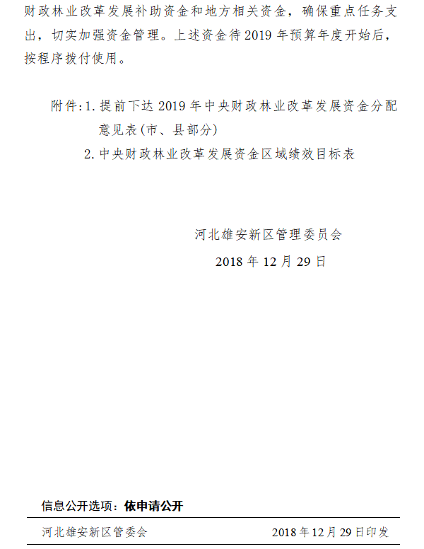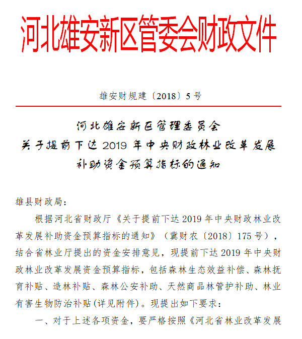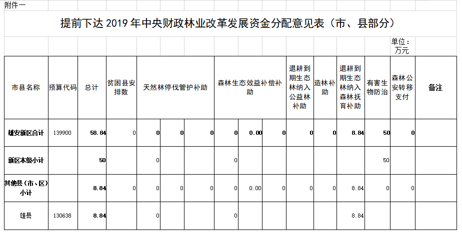 现将雄安新区提前下达2019年中央财政林业改革发展补助资金预算指标资金分配结果予以公告,如有异议,请向以下部门提出意见。