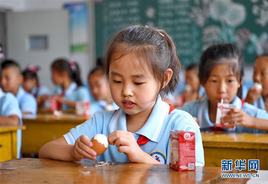 9月1日,河北省乐亭县闫各庄镇中心小学的孩子们在课间享用营养餐。从9月1日起,河北省全省农村小学生都能享受到免费营养餐。营养餐供餐采取课间加餐模式,每天为每个孩子提供一盒学生饮用奶和一个鸡蛋。新华社记者 杨世尧 摄