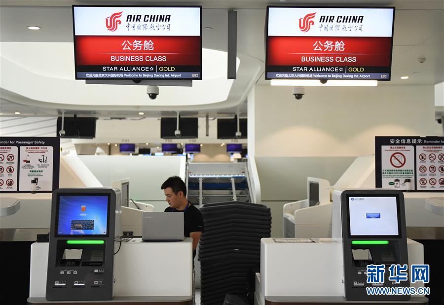 9月4日,工作人员在北京大兴国际机场内部调试设备。随着各项验收的完成,北京大兴国际机场投运在即。北京大兴国际机场是目前世界最大的综合交通枢纽,拥有全球首座高铁地下穿行的机场航站楼、全球首座双层出发双层到达的航站楼、世界最大单体航站楼。新华社记者 张晨霖 摄