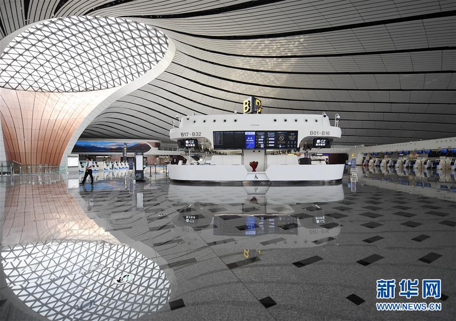 9月4日拍摄的北京大兴国际机场内部。随着各项验收的完成,北京大兴国际机场投运在即。北京大兴国际机场是目前世界最大的综合交通枢纽,拥有全球首座高铁地下穿行的机场航站楼、全球首座双层出发双层到达的航站楼、世界最大单体航站楼。新华社记者 张晨霖 摄