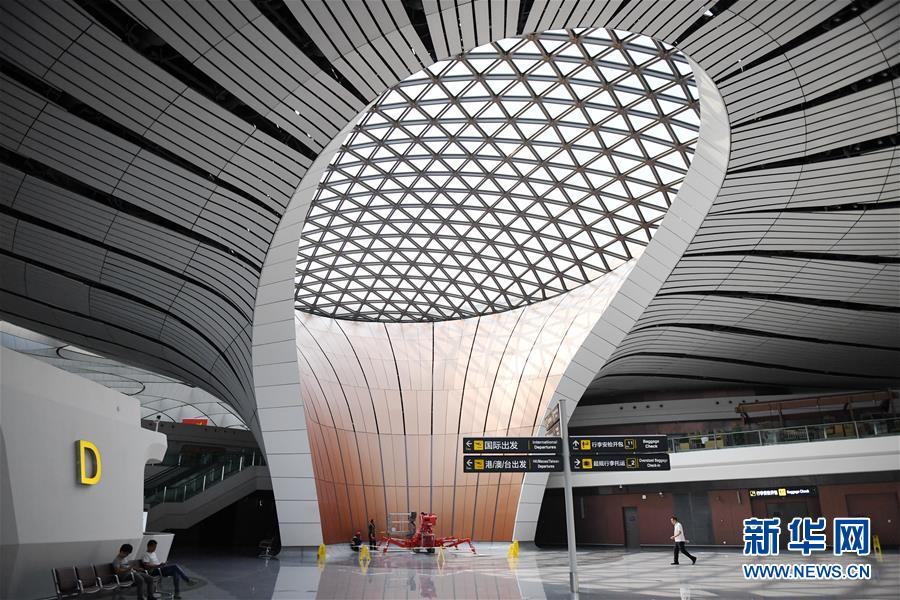 9月4日拍摄的北京大兴国际机场内部。随着各项验收的完成,北京大兴国际机场投运在即。北京大兴国际机场是目前世界最大的综合交通枢纽,拥有全球首座高铁地下穿行的机场航站楼、全球首座双层出发双层到达的航站楼、世界最大单体航站楼。新华社记者 张晨霖 摄