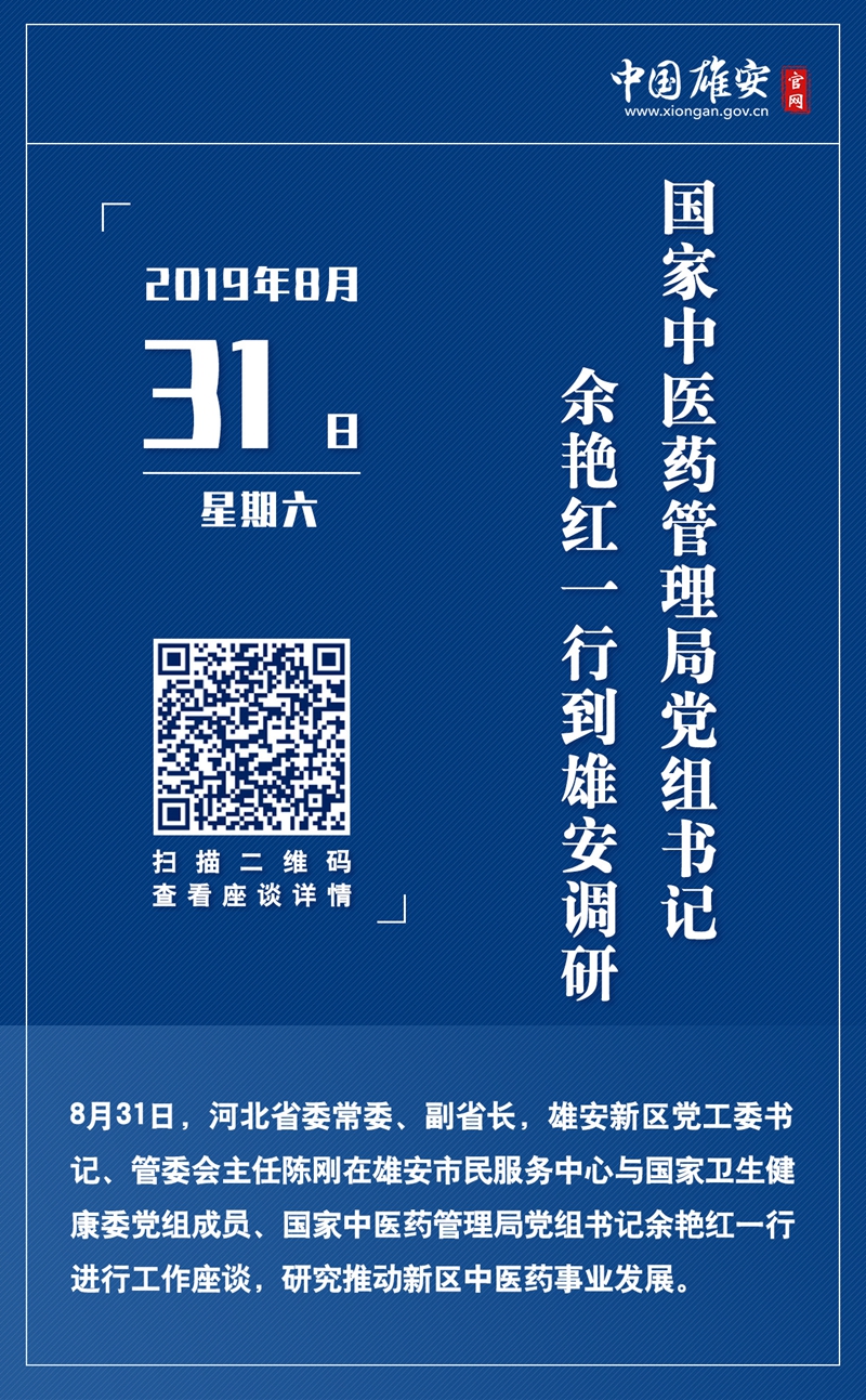 8月31日,河北省委常委、副省长,雄安新区党工委书记、管委会主任陈刚在雄安市民服务中心与国家卫生健康委党组成员、国家中医药管理局党组书记余艳红一行进行工作座谈。