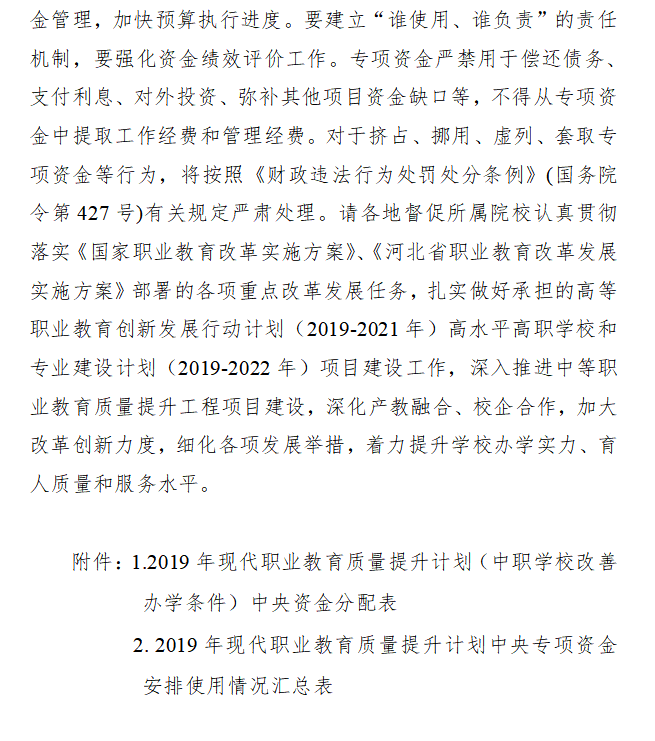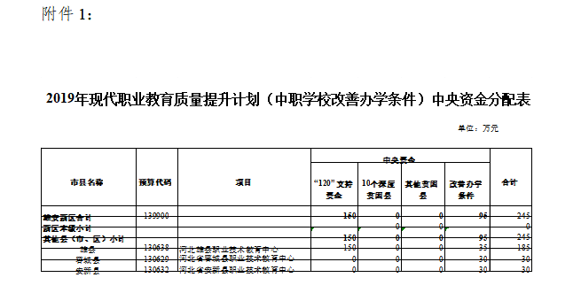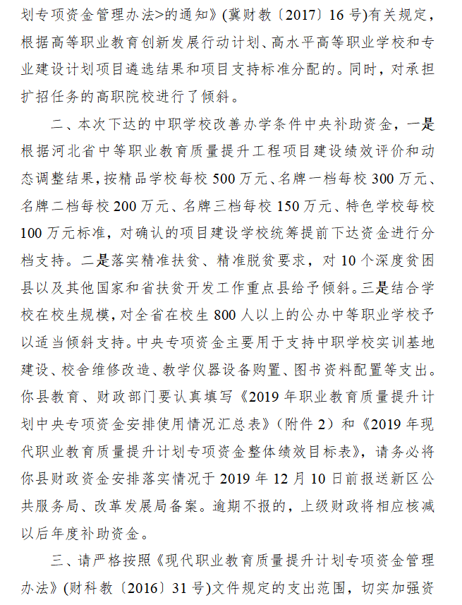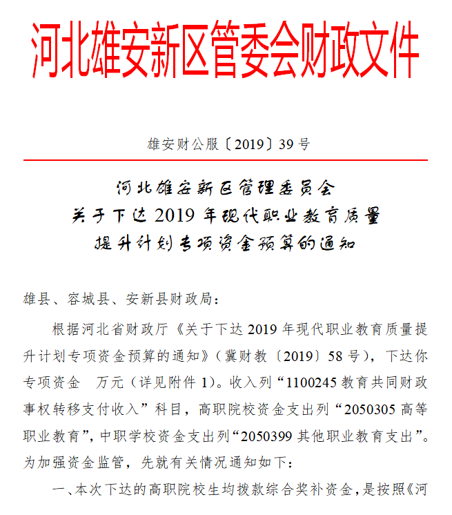现将雄安新区下达2019年现代职业教育质量提升计划专项资金预算资金分配结果予以公告,如有异议,请向以下部门提出意见。