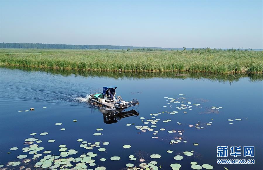 一艘打捞船在白洋淀景区内清理漂浮物(8月31日无人机拍摄)。记者从河北雄安新区管委会了解到,目前,雄安新区已转入大规模实质性开工建设阶段,今年69项重点建设项目已开工20个,剩余项目正在全力推进。京雄城际铁路、千年秀林、白洋淀生态修复等项目建设稳步推进。新华社记者 牟宇 摄