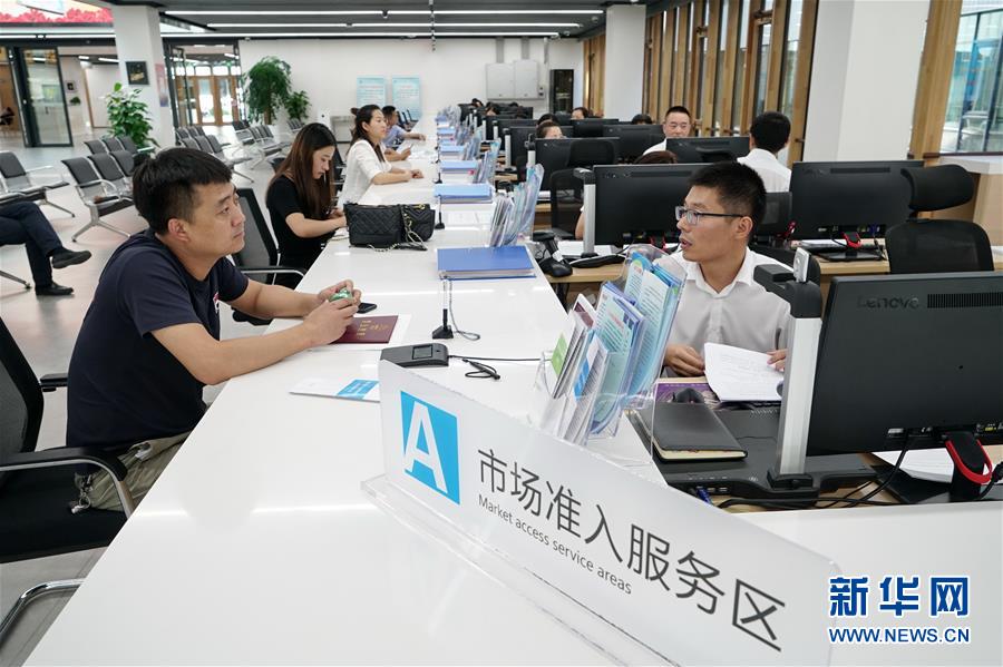 企业工作人员在雄安新区政务服务中心内办理业务(8月30日摄)。记者从河北雄安新区管委会了解到,目前,雄安新区已转入大规模实质性开工建设阶段,今年69项重点建设项目已开工20个,剩余项目正在全力推进。京雄城际铁路、千年秀林、白洋淀生态修复等项目建设稳步推进。新华社记者 牟宇 摄