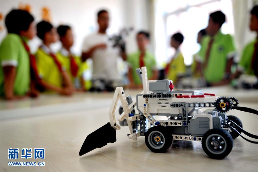 9月5日,在承德市双桥区东园林小学,学生在老师的指导下学习机器人知识。2018年以来,河北省承德市双桥区推出“三点半”课堂,依托校园特色社团并引入校外培训机构为学生提供课后延时服务。学生可自愿在每天下午放学后参加舞蹈、足球、机器人等丰富多彩的社团活动。新华社记者 王晓 摄