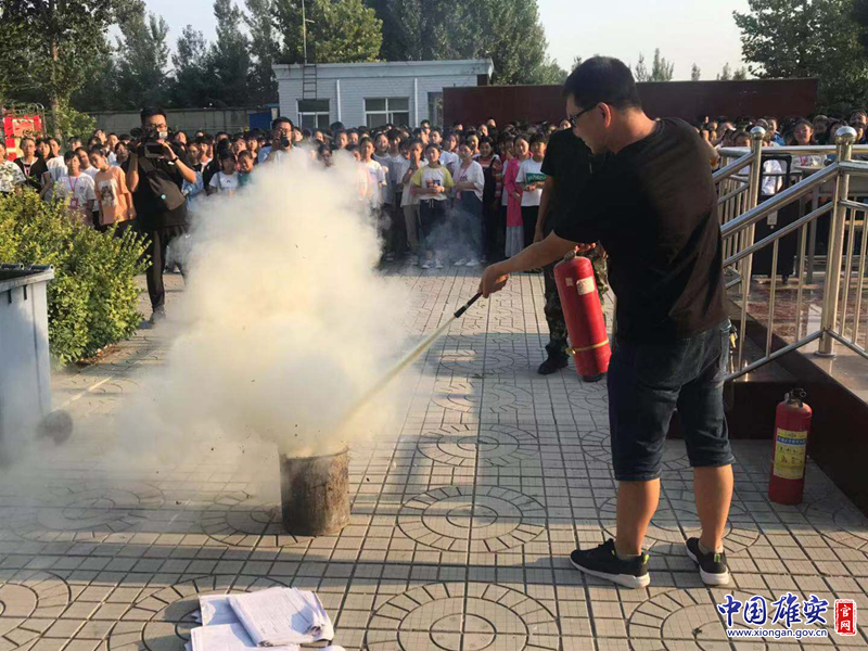 雄安新区容城县消防救援大队秦鹏哲现场对灭火器的使用进行演示。中国雄安官网记者王京卓 摄