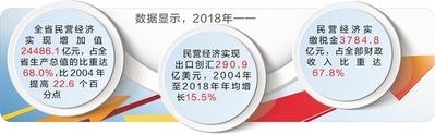 一系列举措激发了民营经济活力,我省民营经济迅速发展。数据显示,2018年,全省民营经济实现增加值24486.1亿元,占全省生产总值的比重达68.0%,比2004年提高22.6个百分点。2018年,民营经济实现出口创汇290.9亿美元,2004年至2018年年均增长15.5%。2018年民营经济实缴税金3784.8亿元,占全部财政收入比重达67.8%。