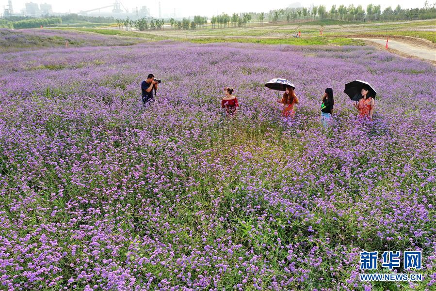 这是游客在唐山市开平区花海中拍照(9月5日无人机拍摄)。 河北省唐山市开平区东湖区域曾因煤矿无序开采,区域内堆场、料场星罗棋布,道路坑洼不平,成为横亘于开平区与唐山市主城区之间的“城市裂痕”。2018年8月,唐山市开始治理这一区域,推动唐山花海项目,目前已初见成效,废弃煤矿变成“千顷花海”。新华社记者 杨世尧 摄