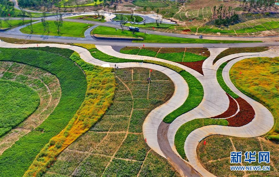 这是唐山市开平区花海项目已建成的部分景区(9月5日无人机拍摄)。 河北省唐山市开平区东湖区域曾因煤矿无序开采,区域内堆场、料场星罗棋布,道路坑洼不平,成为横亘于开平区与唐山市主城区之间的“城市裂痕”。2018年8月,唐山市开始治理这一区域,推动唐山花海项目,目前已初见成效,废弃煤矿变成“千顷花海”。新华社记者 杨世尧 摄