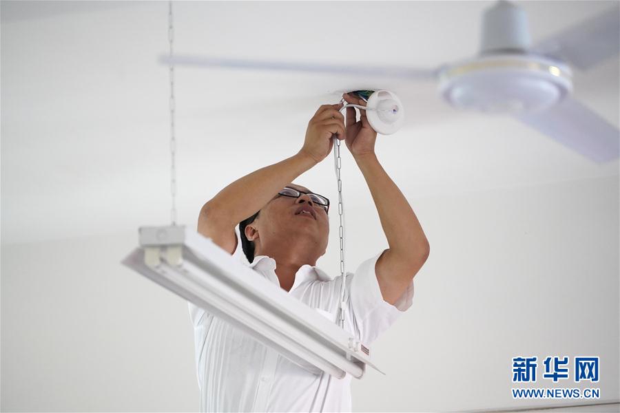 9月5日,赵文波在维修学校的照明灯。