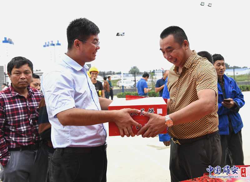 京雄城际铁路雄安站房项目部工作人员为建设者发放中秋礼品。中铁十二局项目部供图