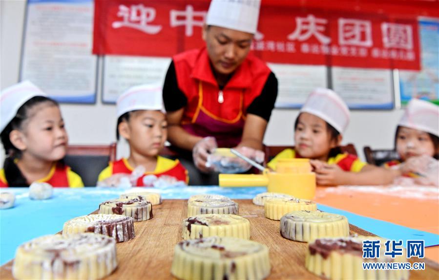 9月13日,河北省廊坊市安次区永华道街道蓝波湾社区开展“迎中秋 庆团圆”主题活动,小朋友在社区志愿者带领下学习制作月饼,欢度中秋佳节。新华社记者王晓 摄