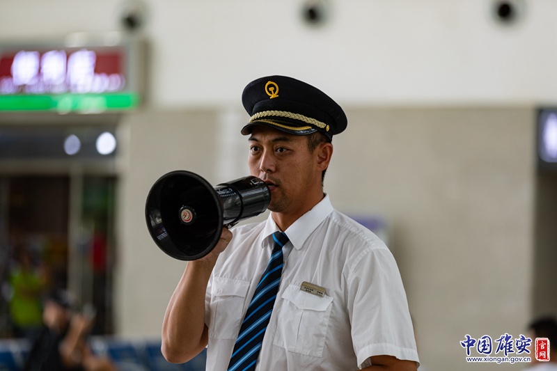 9月15日,白洋淀站候车大厅内,工作人员手持扩音器提醒旅客依序排队检票。中国雄安官网记者高盟 摄