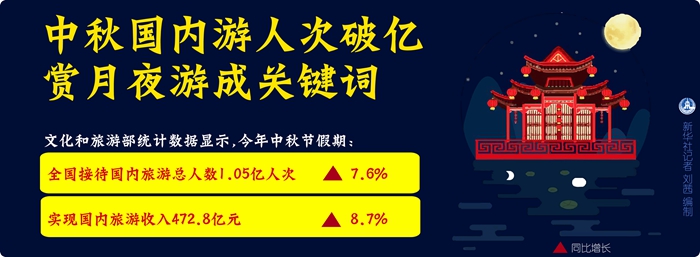 文化和旅游部统计数据显示,今年中秋节假期,全国接待国内旅游总人数1.05亿人次,同比增长7.6%;实现国内旅游收入472.8亿元,同比增长8.7%。