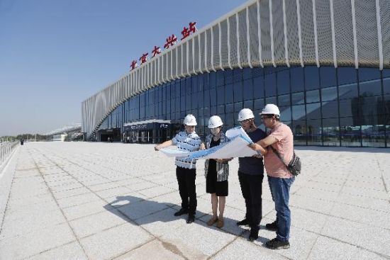9月16日,由中铁第五勘察设计院集团有限公司负责设计的京雄城际北京大兴站开始设计验收工作,标志着京雄城际“出京第一站”已正式竣工,即将投入使用。北京大兴站未来是新机场与北京城区接驳的重要节点,同时也是北京与雄安新区的重要桥梁。该站房为线下式,车场设于高架桥上,总建筑面积17032.42平方米,建筑正立面造型的柔和曲线,取自新机场的正立面剪影,与新机场相呼应。图为设计团队正在进行验收工作。(摄影:杜洋)