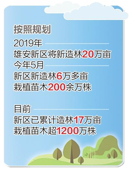中国雄安集团生态公司相关负责人表示,先植绿、后建城,是雄安新区建设的一个新理念。按照规划,2019年雄安新区将新造林20万亩。今年5月,新区完成2019年春季造林任务,新造林6万多亩,栽植苗木200余万株。目前,新区已累计造林17万亩,栽植苗木超1200万株,今年20万亩造林项目正在实施。(记者原付川)