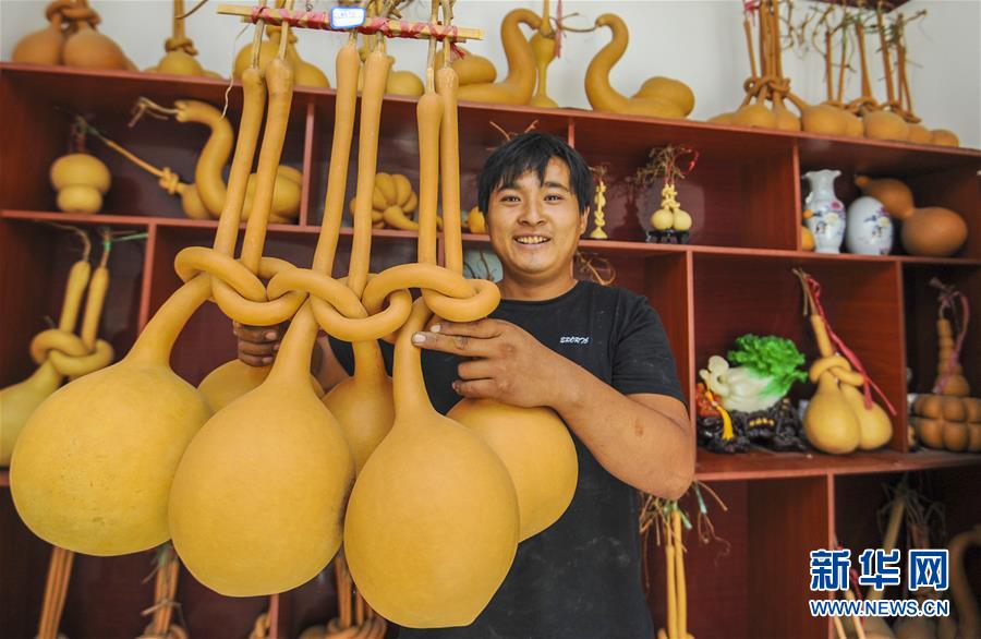 9月17日,河北大城县臧屯镇九间房村村民展示自家种植的绾结葫芦“六六大顺”。近年来,河北大城县大力推进县域文化产业发展,立足特色资源优势,打造出一批红木、乐器、工艺葫芦等行业的“领军者”。目前,该县文化产业相关企业达1300余家,从业人员4万余人,年产值达80亿元。新华社记者李晓果 摄