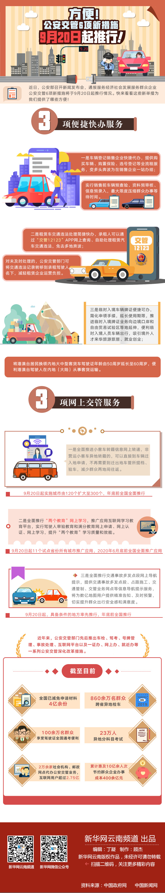 近日,公安部召开新闻发布会,通报服务经济社会发展服务群众企业公安交管6项新措施将于9月20日起推行情况。快来看看这些新举措为我们提供了哪些方便!