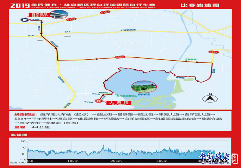 本届赛事将于10月13日开赛,是雄安新区举办的首届国际自行车赛。届时,选手们将从白洋淀火车站出发,沿津海大街、白洋淀大道、温白路、环堤路等骑行,途径千年秀林、雄州牌楼、白洋淀景区等景点,最终到达终点大渠沟,全程44公里。