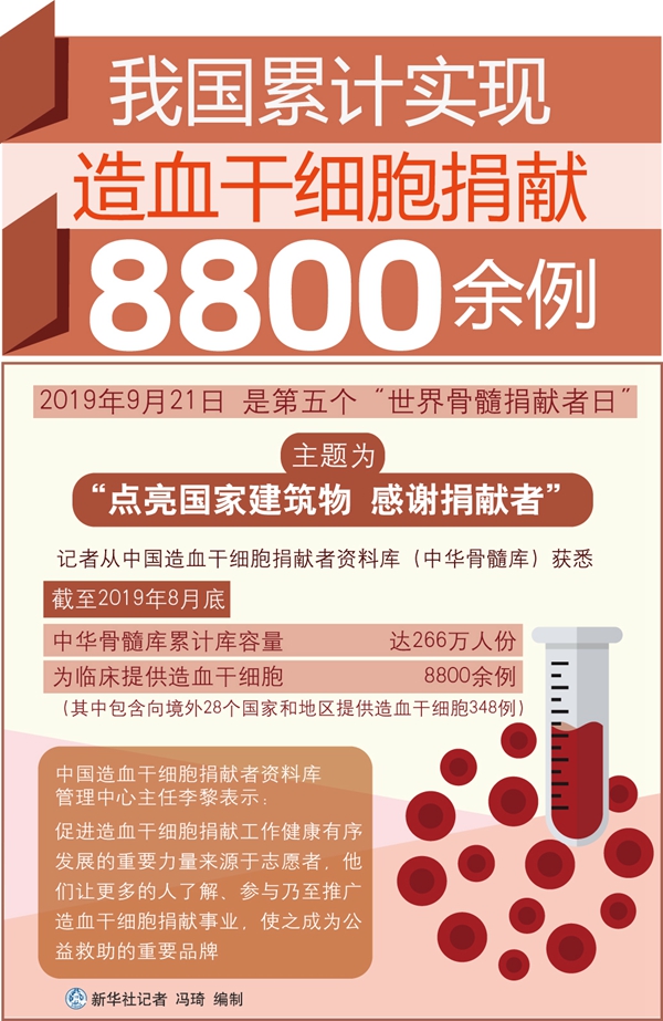 新华社西安9月21日电(记者蔺娟 吴鸿波)记者从中国造血干细胞捐献者资料库(中华骨髓库)获悉,截至2019年8月底,中华骨髓库累计库容量已达266万人份,为临床提供造血干细胞8800余例,其中包含向境外28个国家和地区提供造血干细胞348例。