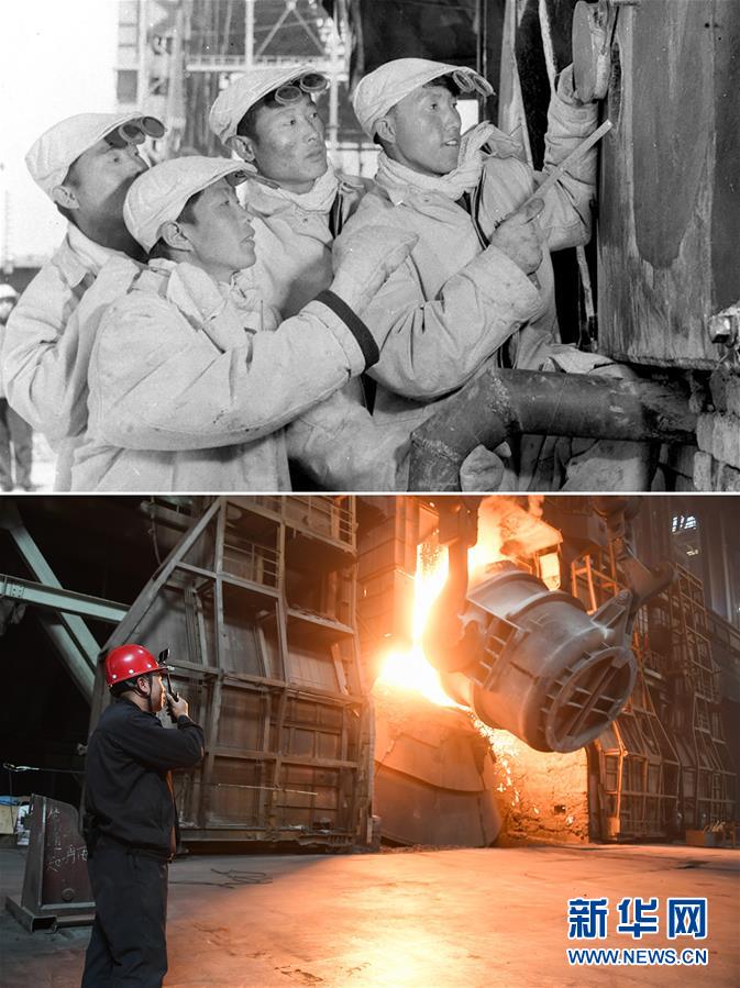 拼版照片:上图为1960年,负责内蒙古包钢一号大平炉开炉生产的炼钢工人们在观察炉温上升情况(崔晓华摄);下图为2019年6月4日,内蒙古包头钢铁(集团)有限责任公司转炉总工长刘铭在转炉炼钢现场用对讲机指挥操作(新华社记者刘磊摄)。