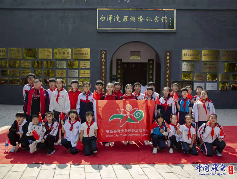 孩子们在白洋淀雁翎队纪念馆门口合影留念。中国雄安官网发