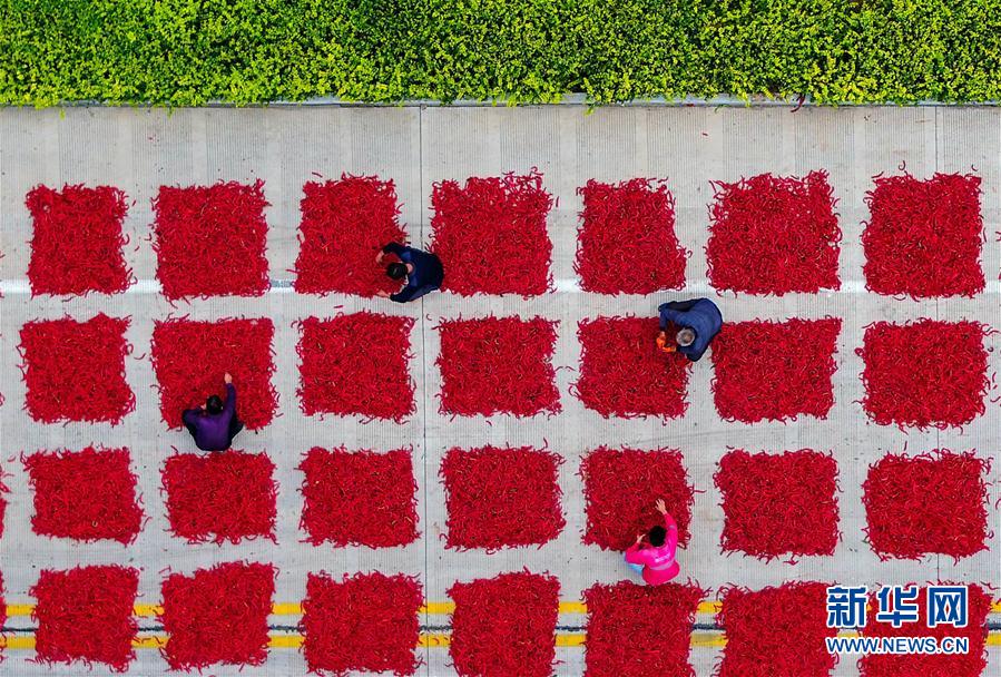 农户在河北省邯郸市鸡泽县一家辣椒加工厂内晾晒辣椒(9月19日无人机拍摄)。