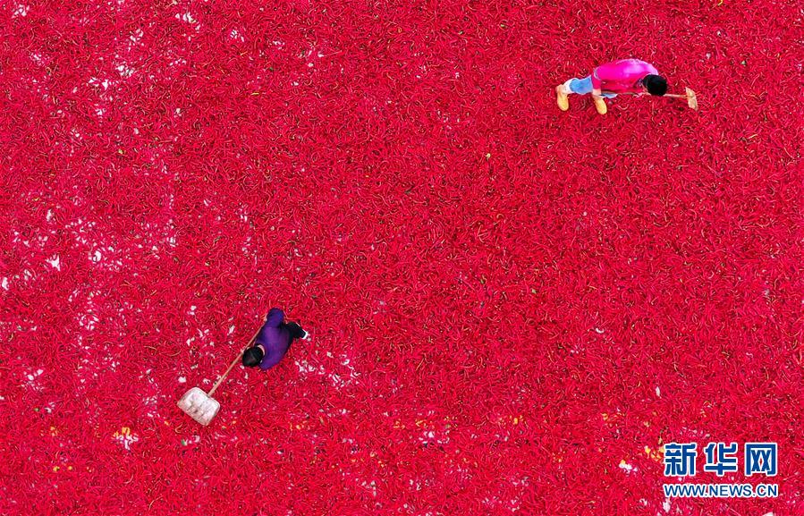 农户在河北省邯郸市鸡泽县一家辣椒加工厂内晾晒辣椒(9月19日无人机拍摄)。
