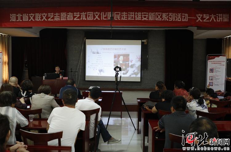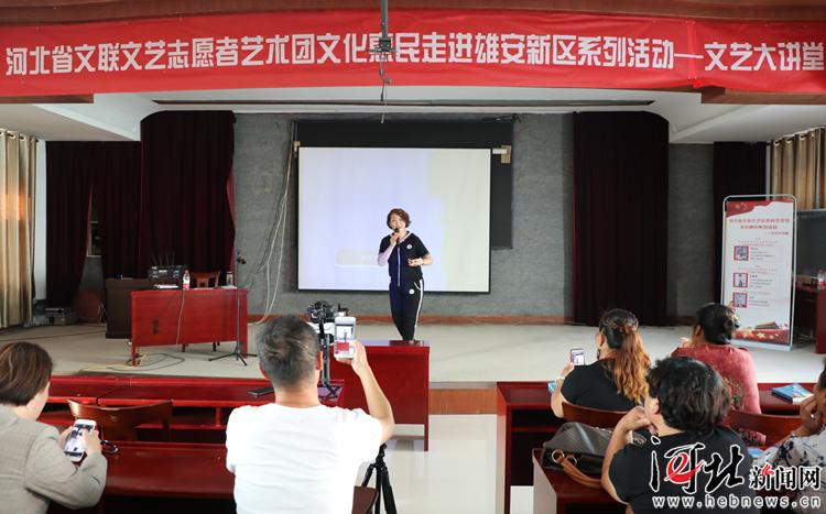 当天上午,文艺大讲堂开讲,标志着系列活动正式启动。河北省剧协常务理事,河北电视台编导郑标带来《京剧,中国人的文化乡愁》主题讲座,从唱念做打讲起,启发了大家对京剧另一个维度的认识和理解。河北省文联副主席,河北省剧协副主席兼秘书长,国家一级导演贾吉庆进行了《争做德艺双馨的文艺工作者》主题讲座。河北省戏剧家协会副主席、中国戏剧梅花奖获得者、国家一级演员彭蕙蘅带来了《河北梆子艺术讲座》,她用深厚的艺术积淀,深入浅出地为雄安新区人民普及了河北梆子的艺术常识。