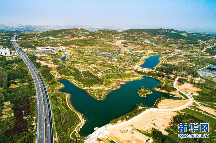 武安市九龙山矿山生态修复公园一角(9月26日无人机拍摄)。位于河北省武安市的九龙山原来曾有20多处废弃矿场。近年来,武安市加强环境治理,大力推进矿山生态修复工程,让废弃的矿山重新披上绿装变为生态公园。新华社记者王晓 摄