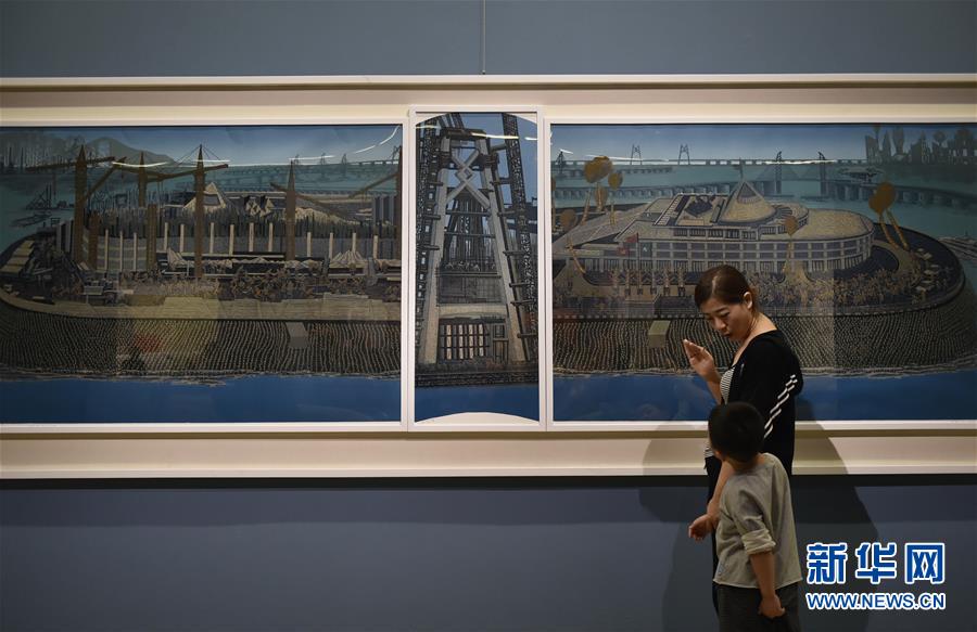 9月26日,观众在中国美术馆参观展出作品《天下飞梁》。当日,“伟大历程 壮丽画卷——庆祝中华人民共和国成立70周年美术作品展”在北京中国美术馆开幕。展览以中国美术馆的馆藏作品为主,同时汇集国内20余个重要美术馆的经典藏品,共展出国画、油画、雕塑等480余件作品。新华社记者 鲁鹏 摄