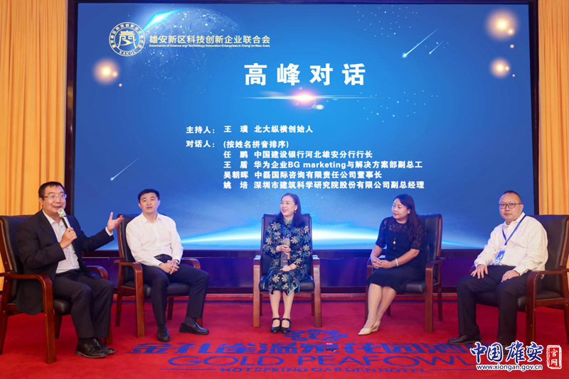 在高峰对话环节,中国建设银行河北雄安分行行长任鹏、华为企业BG marketing与解决方案部副总工王盾、中磊国际咨询有限责任公司董事长吴朝晖、深圳市建筑科学研究院股份有限公司副总经理姚培共同探讨建设雄安新区大环境下企业发展策略和机遇。