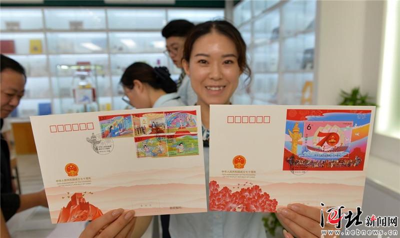 10月1日,中国邮政发行《中华人民共和国成立七十周年》纪念邮票。该纪念邮票1套5枚,小型张1枚。邮票图案名称分别为:经济持续健康发展、社会主义民主政治推进、文化繁荣兴盛、人民生活不断改善、建设美丽中国,小型张图案名称为:祝福祖国。全套邮票面值为12元。图为邮政工作人员在中国邮政集团公司石家庄市分公司长安网点展示该套纪念邮票。记者田明 摄