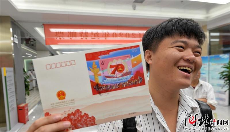 成功购买到《中华人民共和国成立七十周年》纪念邮票的市民开心不已。记者田明 摄