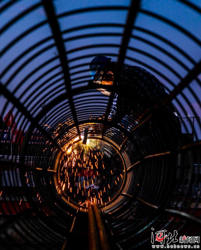京雄城际铁路雄安站二标段,工人在焊接钢筋笼。通讯员张权 摄